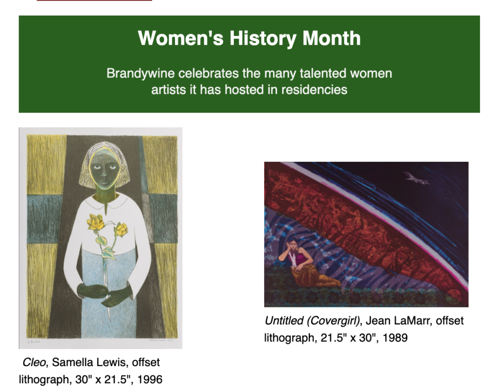 March is Women’s History Month: Brandywine celebrates the many talented womenartists it has hosted in residencies, a video segment of PBS highlighting Brandywine. And more…
